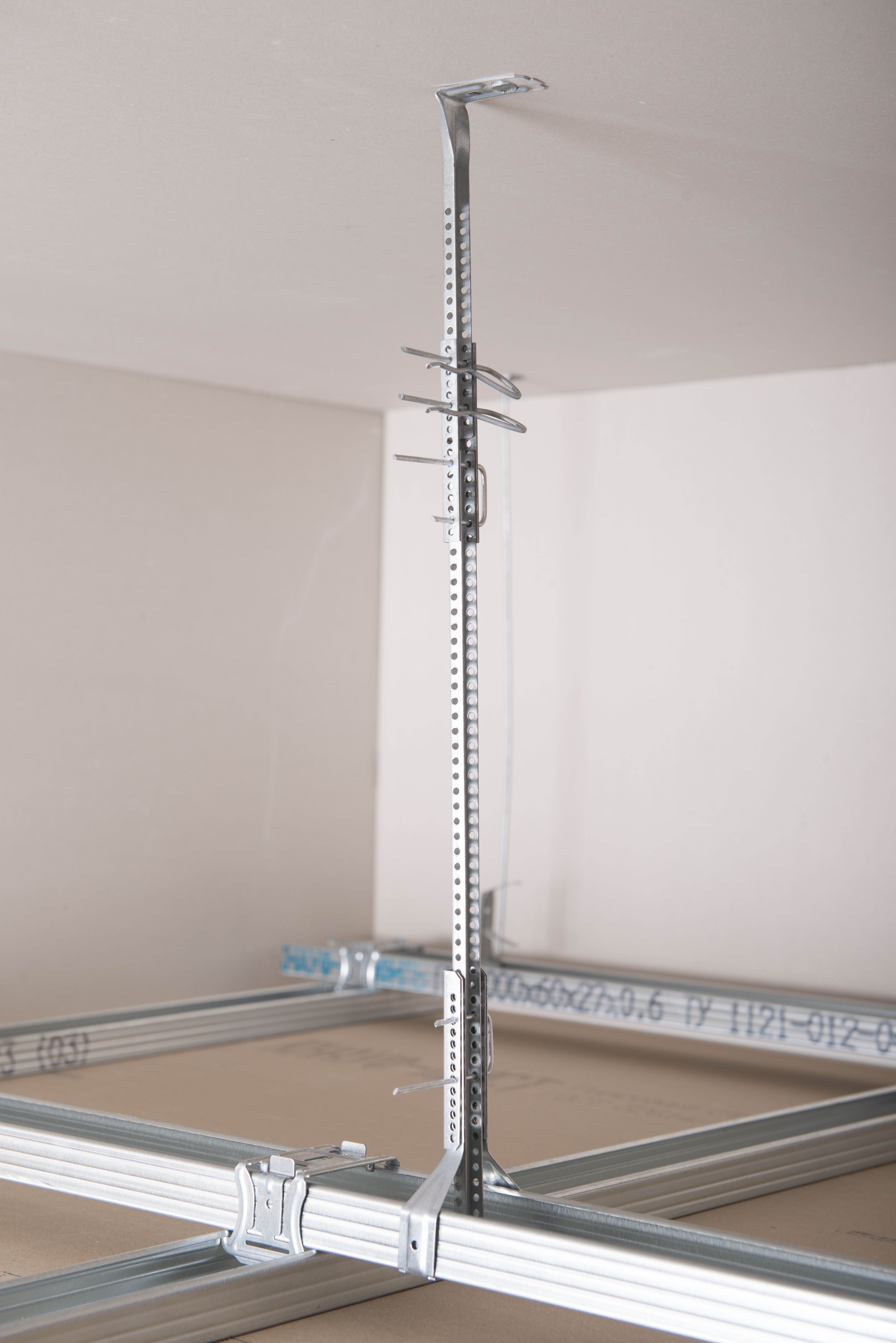Подвес-Нониус предназначен для крепления каркаса подвесного потолка из КНАУФ-профилей ПП 60х27. Используется для потолочных систем с повышенным весом и большой высотой внутрипотолочного пространства.
