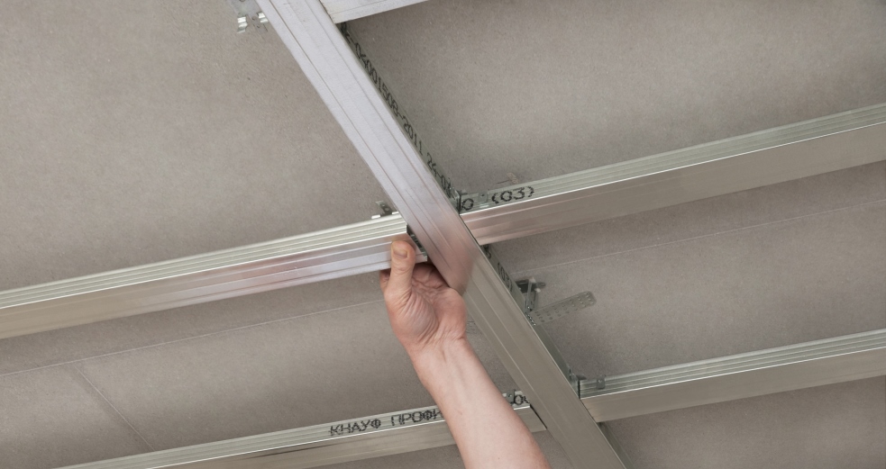 Подвесные потолки с использованием профиля КНАУФ – это оптимальное решение для выравнивания потолков, скрытия коммуникаций и улучшения акустики. Каркас создается из потолочных профилей, соединенных комплектующими (соединители, подвесы и т.д.), а гипсокартон крепится к каркасу шурупами.