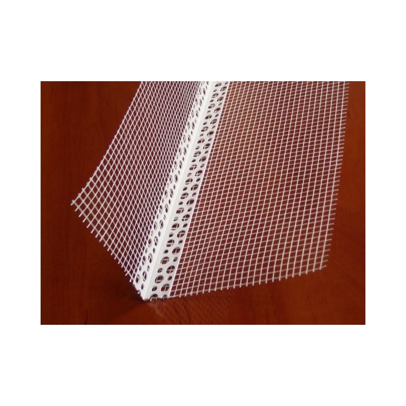 Профиль изготовлен из ПВХ и имеет перфорацию по всей длине. К профилю приклеена щелочестойкая сетка размером 10х15см для большего сцепления со стеной и улучшения качества штукатурных работ.