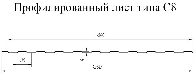 Важной особенностью профнастила оцинкованного С8 является отсутствие ребер жесткости, так как ширина полок профиля больше высоты волны, поэтому данный профнастил чаще всего применяется для вертикальной установки.