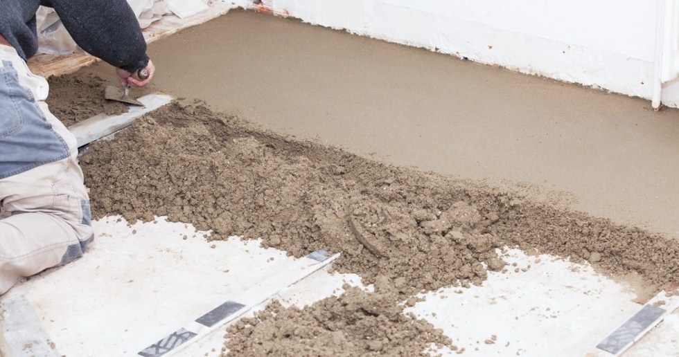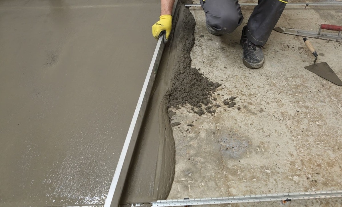 Стяжки пола устраиваются по маякам, полосами шириной 50 см, ограниченными рейками. Правильность установки маяков проверяется уровнем. Свежеуложенный раствор ровнителя для пола (литой бетон) распределяется с помощью правила или стального шпателя. Все трещины и углубления предварительно заполняются раствором. Рекомендуемая толщина слоя 20-50 мм. Хождение по покрытию допускается не ранее чем через 24 часа после укладки.
