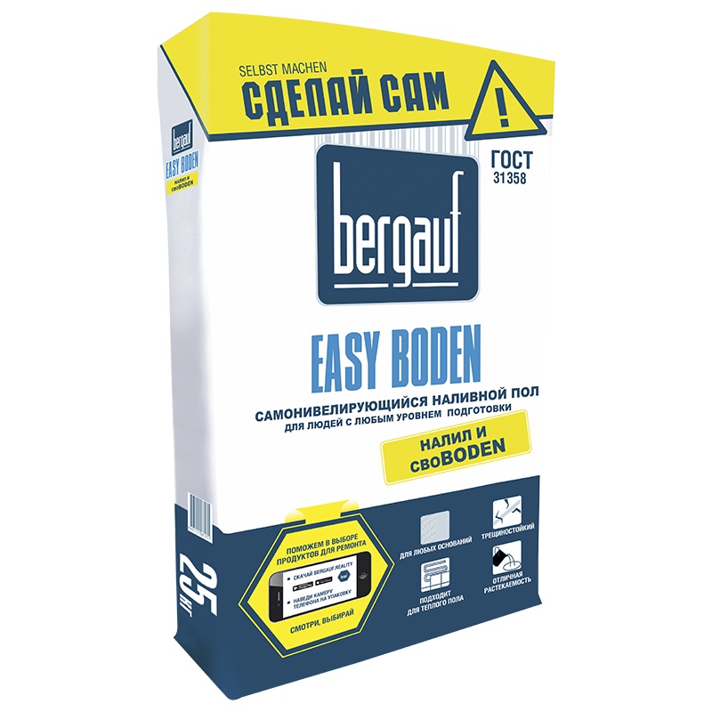Ровнитель Бергауф Easy Boden 25 кг - самовыравнивающийся наливной пол. Является современной разновидностью стяжки. Подходит для людей с любым уровнем подготовленности. Возможно как машинное так и ручное нанесение.