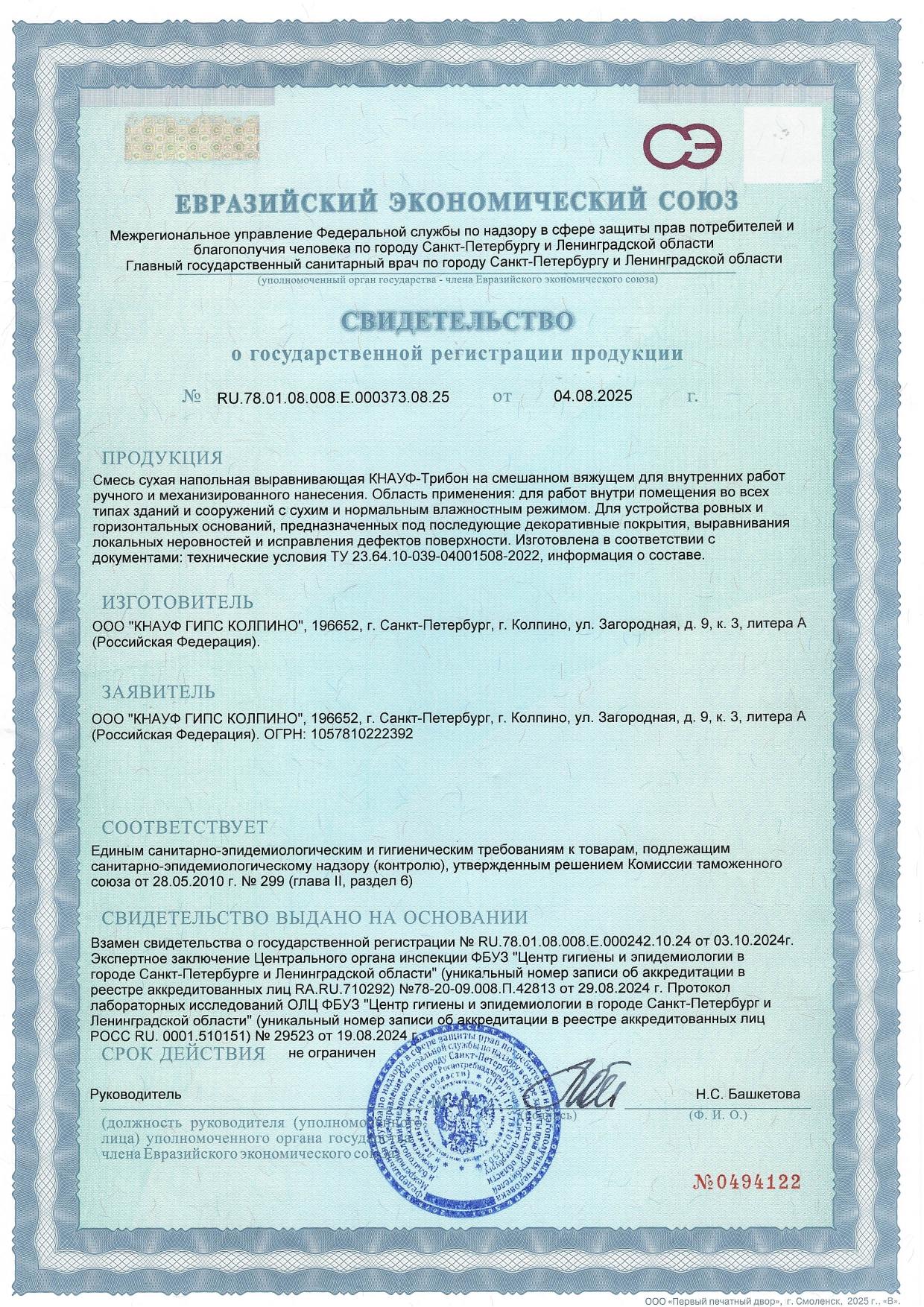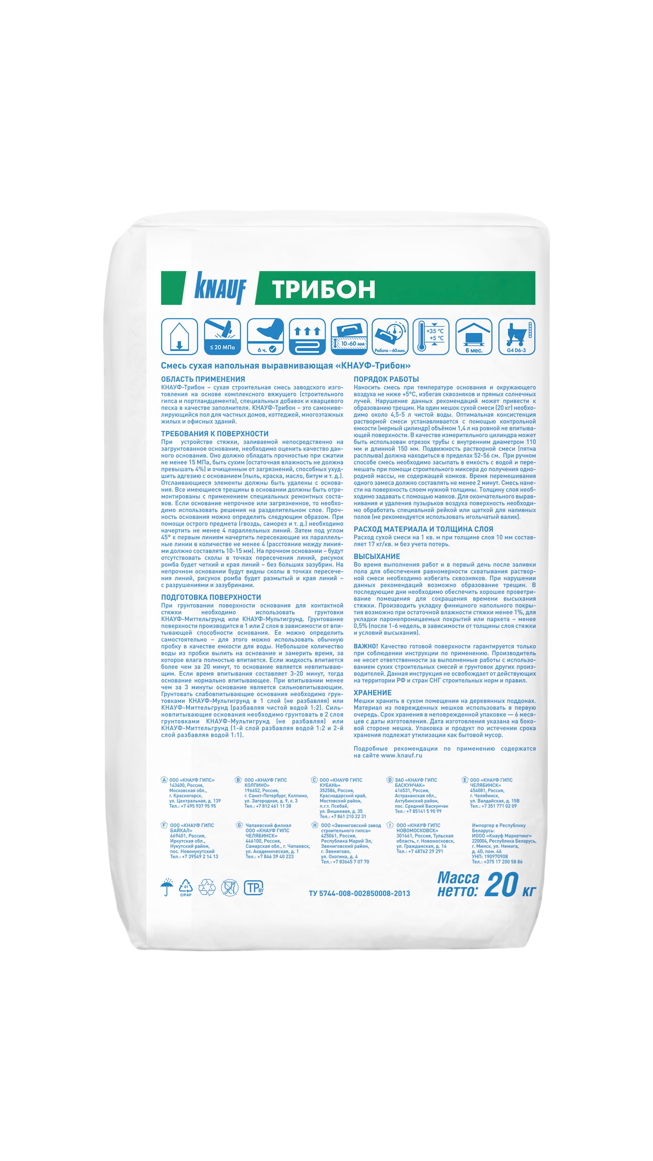 Ровнитель КНАУФ Трибон (пол самонивелирующийся универсальный толщиной от 10 до 60 мм) - сухая строительная смесь на основе смешанного (комплексного) вяжущего (строительного гипса и портландцемента), специальных модифицирующих добавок и кварцевого песка в качестве заполнителя.