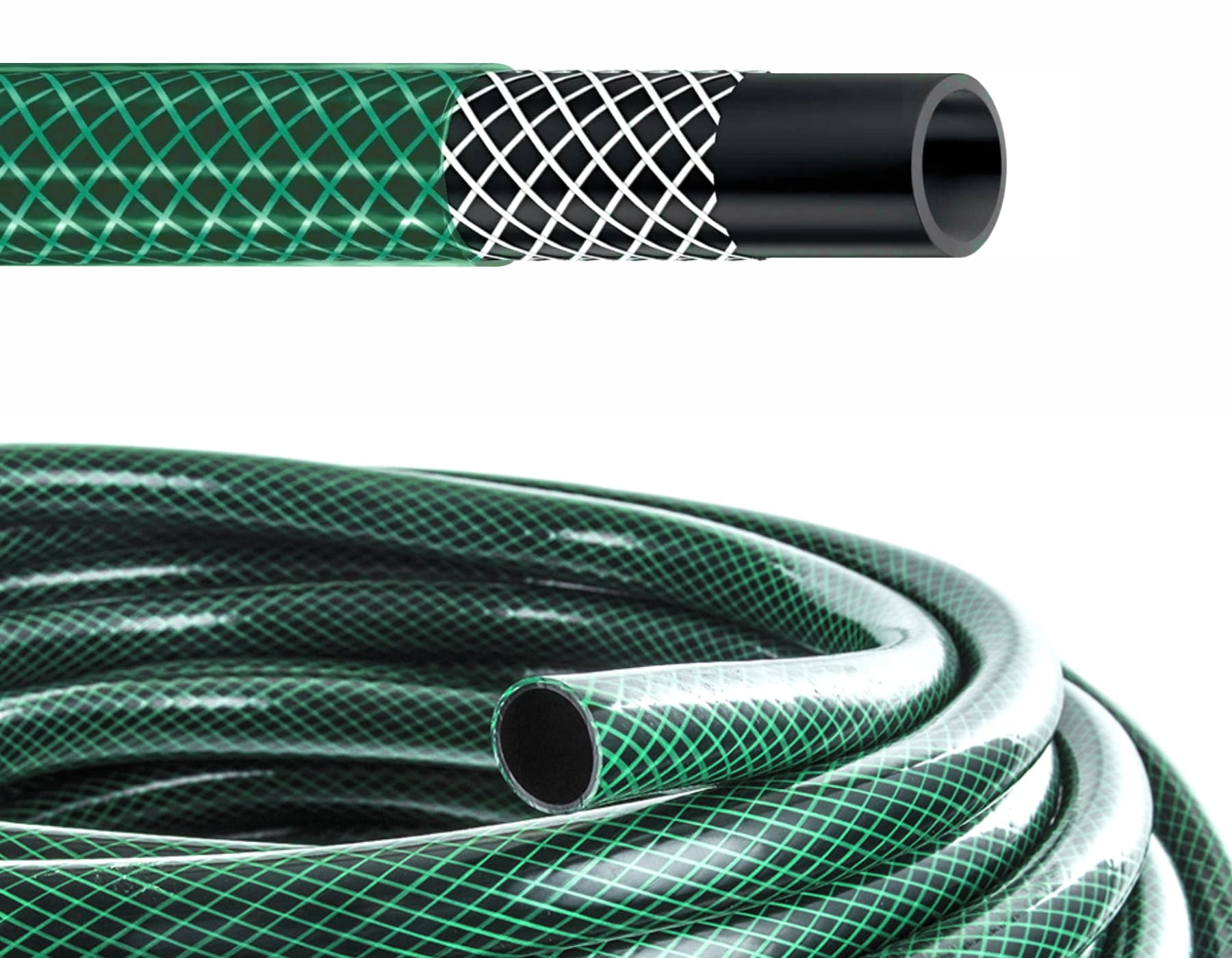 - Наружный слой - прозрачный зеленый ПВХ, защищающий шланг от ультрафиолета и стирания.