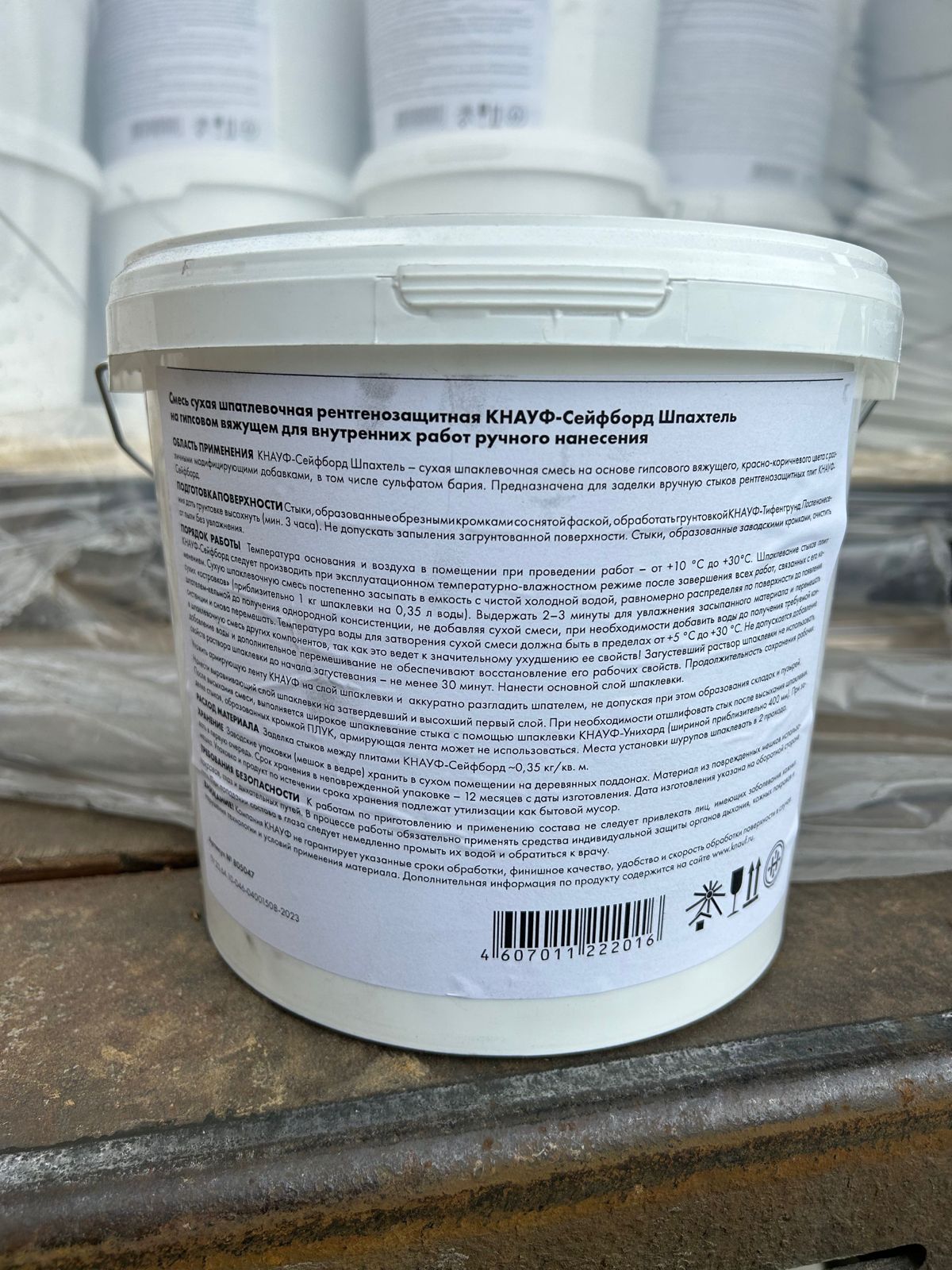 Упаковка: Смесь КНАУФ-Сейфборд Шпахтель фасуется в полиэтиленовые мешки по 5 кг. Каждый мешок упаковывается в пластиковое ведро.