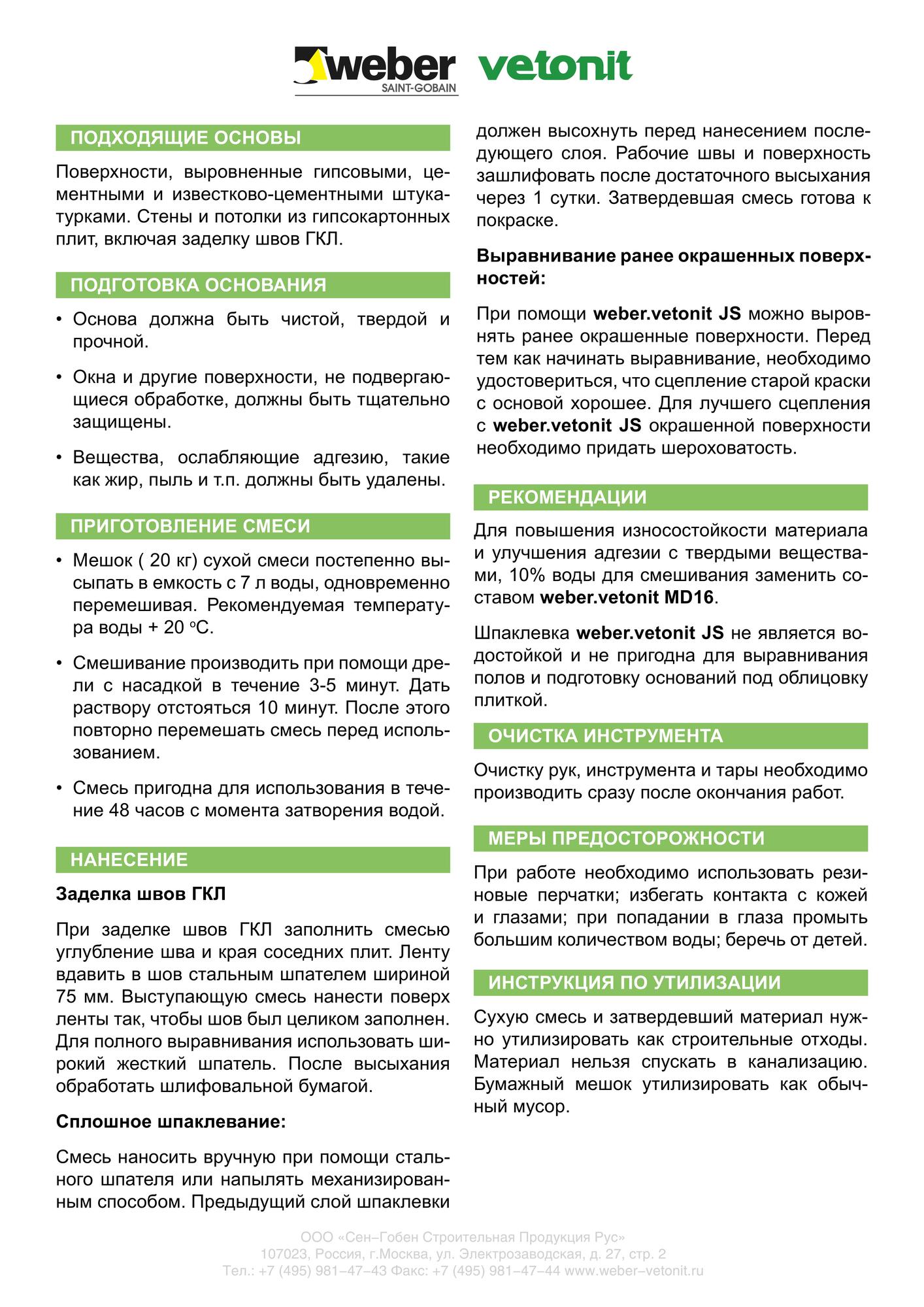 Мешок сухой смеси ВеберВетонит Силойте JS смешивают с 8-9 литрами чистой воды. Для смешивания используют мощную дрель с насадкой. Время смешивания 1-2 минуты. Для лучшего растворения связующего, смеси дают отстояться в течение прим. 15 минут. После повторного перемешивания смесь готова к использованию. Растворная смесь ВеберВетонит Силойте JS пригодна для использования в течение 2 суток с момента затворения водой (хранить в закрытой емкости).