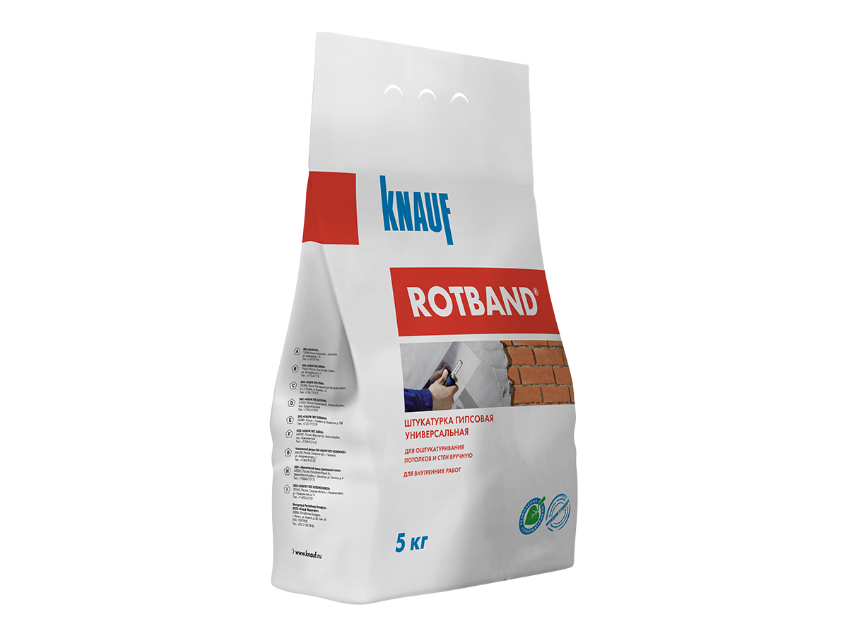Штукатурка КНАУФ-Ротбанд гипсовая для стен и потолков 5кг - универсальная сухая штукатурная смесь на основе гипсового вяжущего с добавками, обеспечивающими повышенную адгезию. Это сухая штукатурка производства всемирно известной компании Knauf. Смесь состоит из гипса и специальных добавок, обеспечивающих максимально прочное сцепление с поверхностью. Предназначена для оштукатуривания вручную стен и потолков с любым типом поверхности (бетон, кирпич, пенополистирол, ДСП и т.п.) внутри помещений с нормальной влажностью, включая кухни и ванные комнаты в жилых помещениях.