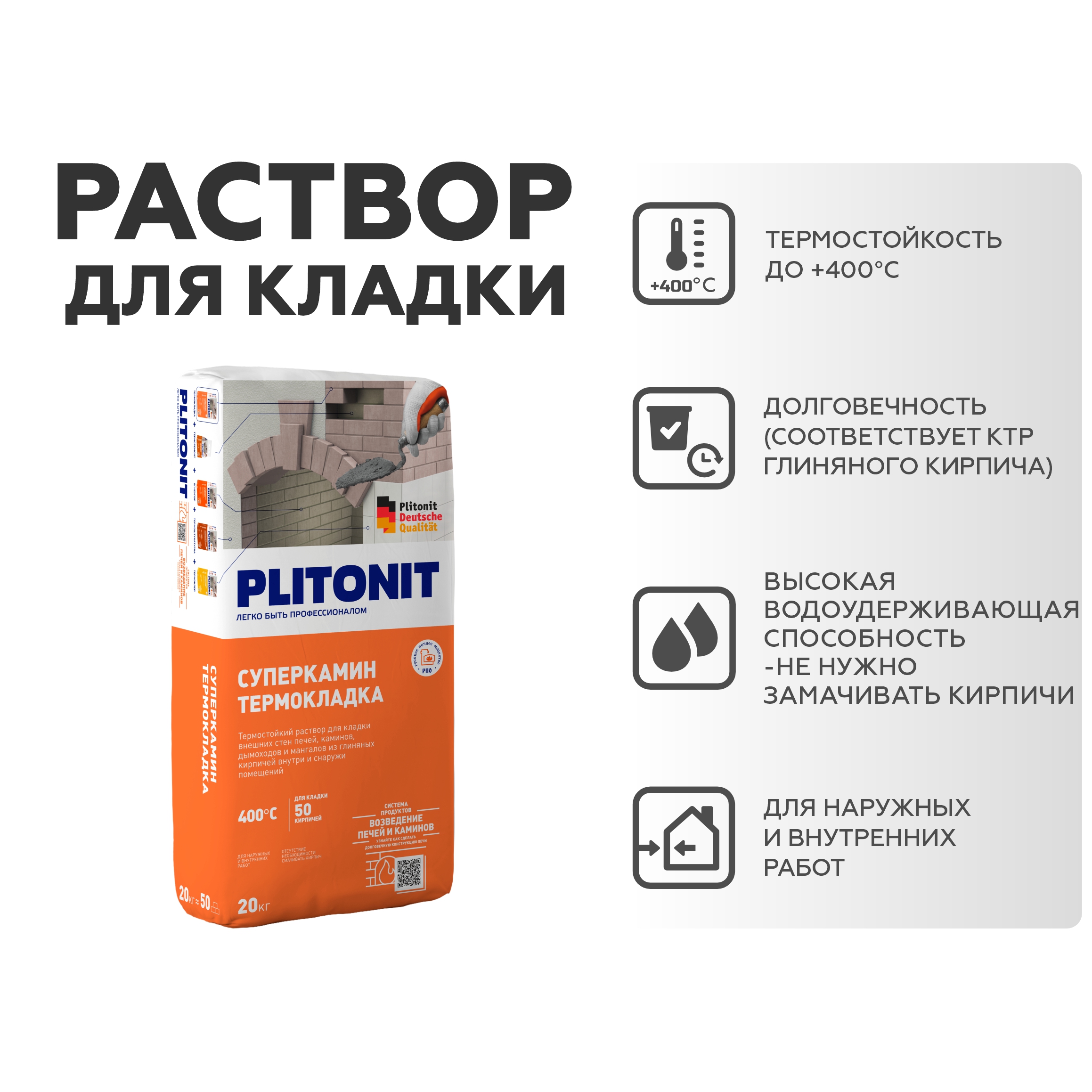 Смесь ПЛИТОНИТ СуперКамин термостойкая 20кг – сухая строительная смесь на основе специализированного цемента с модифицирующими добавками и термостойким наполнителем, предназначенная для кладки внешних стен печей, каминов и дымоходов при внутренних и наружных работах. Используется для монтажа глиняных кирпичей. Смесь ПЛИТОНИТ СуперКамин обладает высокой технологичностью и водоудерживающей способностью, а также влагостойкостью и трещиностойкостью. Коэффициент температурного расширения раствора соответствует глиняному кирпичу.