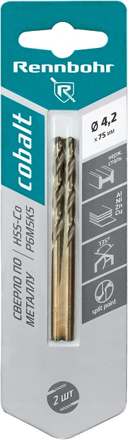 Сверло по металлу кобальтовое Rennbohr COBALT 4,2 х 75 мм (2шт/уп)