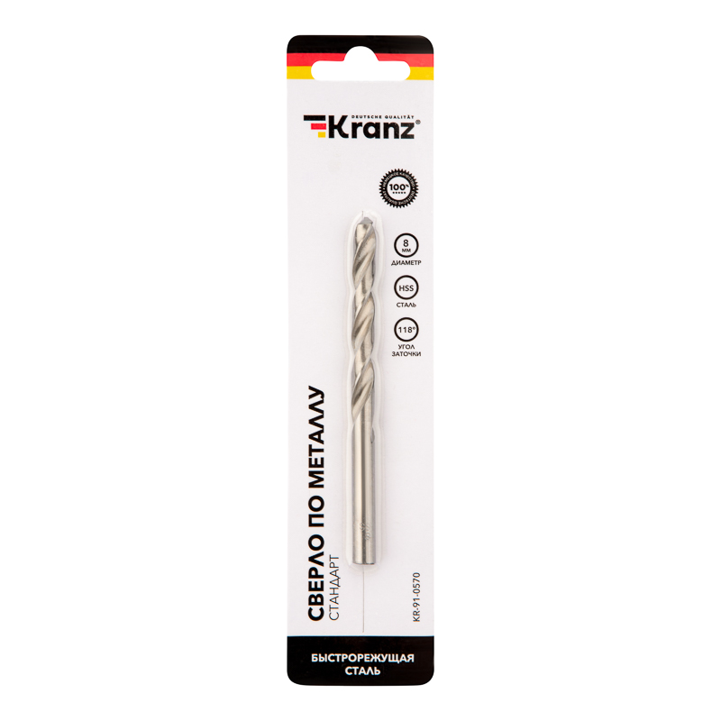 Сверло KRANZ изготовлено по стандарту DIN 338 и используется для сверления отверстий в таких материалах, как сталь, дерево и пластик.