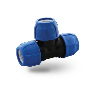 Тройник компрессионный предназначен для сопряжения труб ПНД. Два фитинга тройника соосны, третий расположен перпендикулярно к их оси.