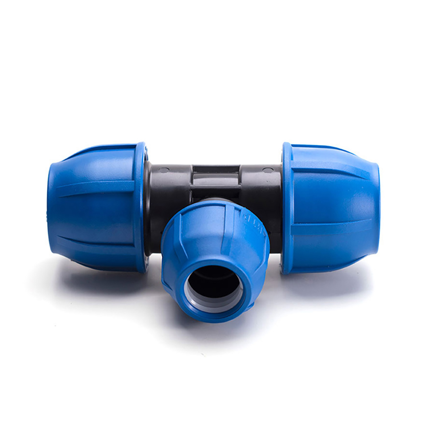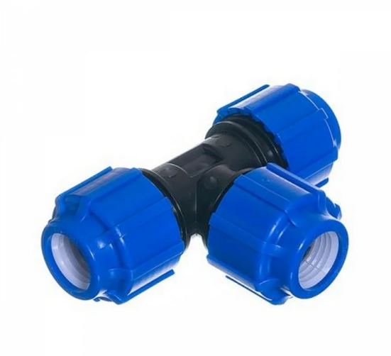 Тройник компрессионный предназначен для сопряжения труб ПНД разного диаметра. Два фитинга тройника соосны, третий расположен перпендикулярно к их оси.