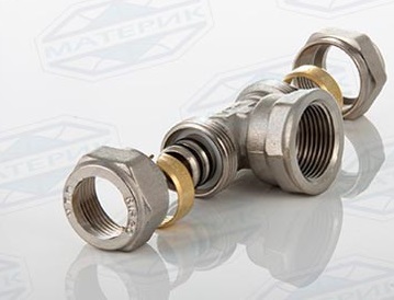 Корпус фитингов и накидная гайка выполнены методом горячего прессования из латуни марки CW617N (евростандарт EN 12165), уплотнительные кольца (их два) – из синтетического каучука EPDM с эластомерными присадками. Тефлоновая прокладка исключает электрический контакт между алюминием трубы и латунью. Никелевое покрытие корпуса предотвращает вымывание цинка и коррозию латуни. Разрезное обжимное кольцо изготавливается из трубы (а не из ленты, как у других производителей). Это обеспечивает равномерное обжатие трубы по всему диаметру.