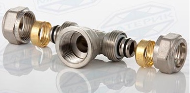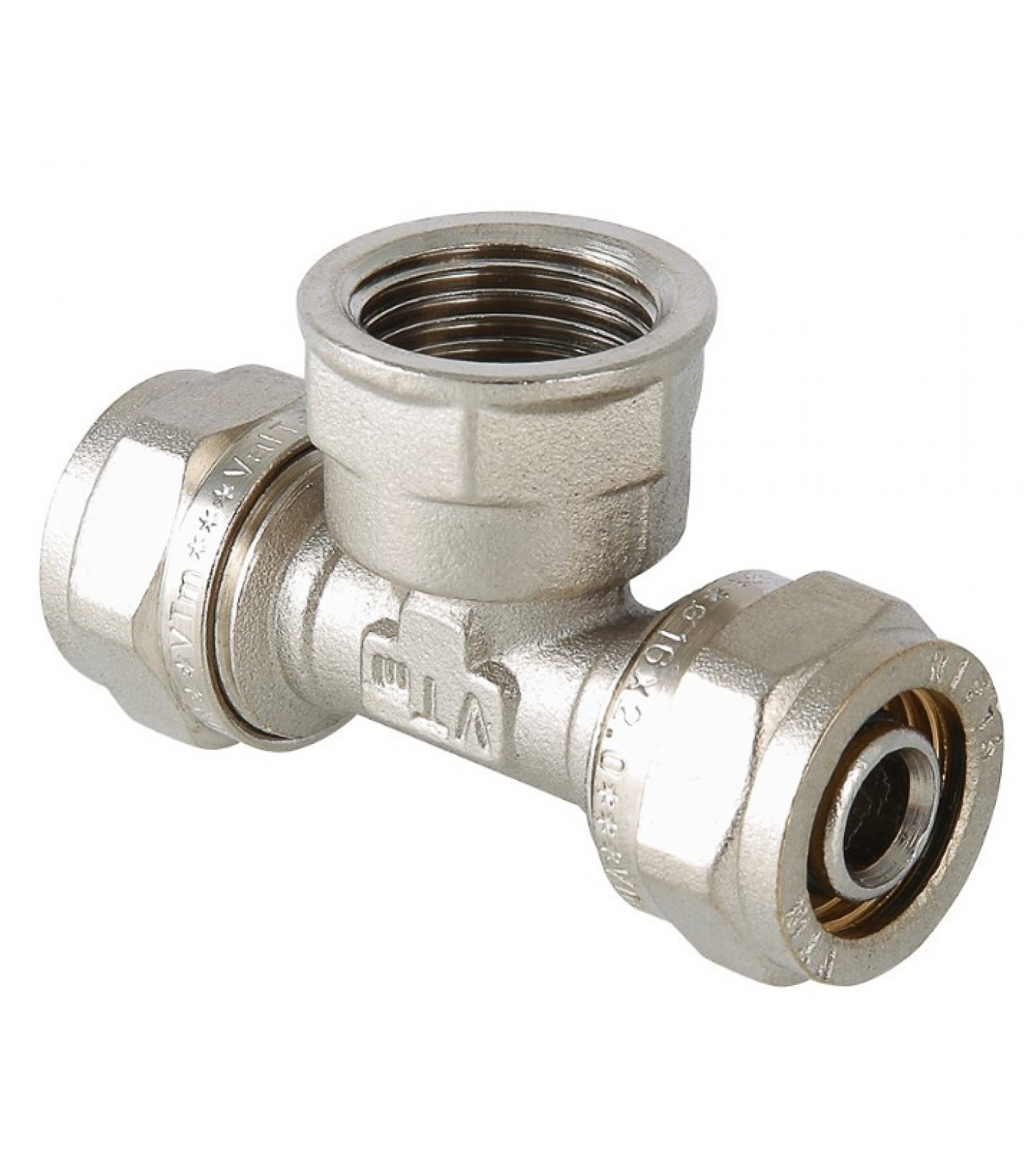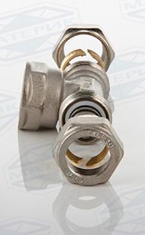 Трехсторонний латунный никелированный фитинг для подсоединения к металлопластиковому трубопроводу компонента с резьбовым подключением. Резьба фитинга – внутренняя трубная по ГОСТу 6357.