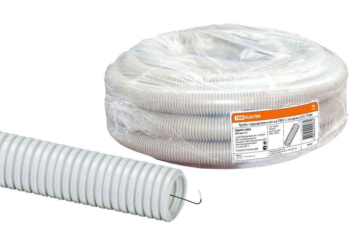 Труба гофрированная ПВХ серая с зондом 25мм 50 м/уп предназначена для защиты проводов и кабелей при прокладке сложных систем и трасс. Промрукав защищает провода от механических повреждений, агрессивного воздействия окружающей среды и обеспечвает пожарную безопасность электропроводки.