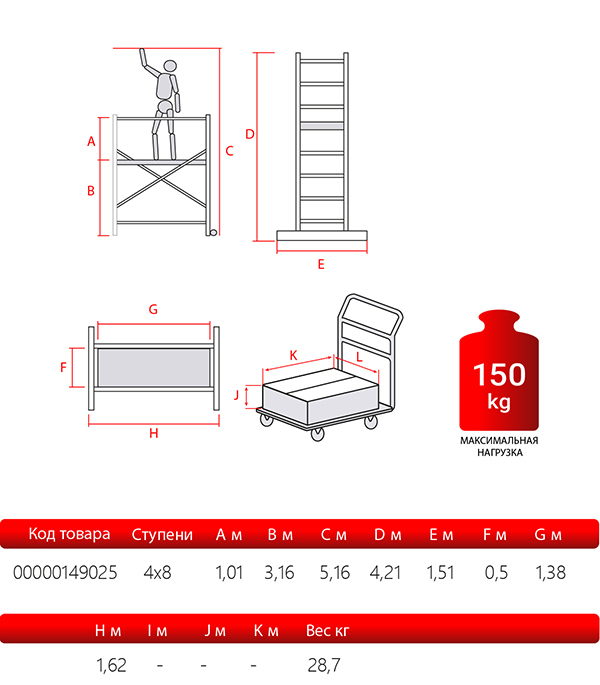 Вышка-тура 5м – идеальна для бытового и профессионального использования при выполнении ремонтных, строительных и отделочных работ как внутри помещений, так и на улице.