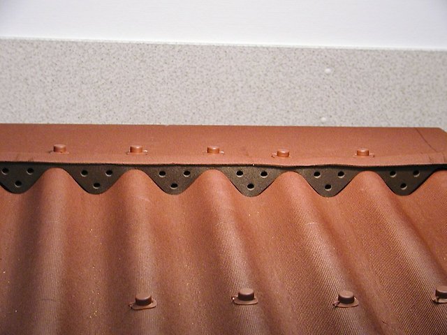 Устанавливается в просветы между обрешеткой и кровельными листами Ондулин на карнизе или между листами и коньковым элементом на хребте кровли. В зависимости от того, нужна ли вентиляция или тотальная защита, заполнитель можно делать вентилируемым или невентилируемым: для этого предусмотрены специальные отверстия, которые в случае необходимости освобождаются обычной отверткой.