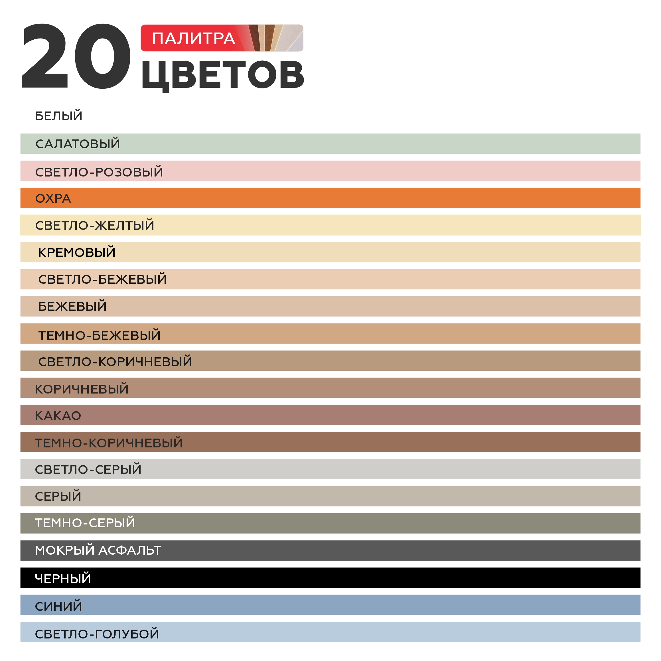 - Широкая цветовая гамма – 20 цветов;